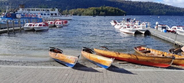 Bowness on Windermere landing stage with boats on water’s edge
