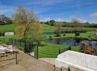 - Terrace with view of the gardens at Damson Dene Hotel